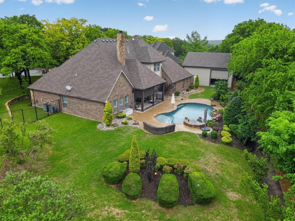 DON'T LET THIS HOME PASS YOU BY!! Check out this breathtaking home nestled in tall trees with a detached 30 x 35 two story shop with elevator located within the award winning ALEDO ISD, easy access to I-20 with Weatherford lake just a few blocks over. Step into a world of warmth and comfort as you enter the open-concept living space, perfect for creating lasting memories with loved ones. This home has space for everyone with room to grow; boasting 5 bedrooms, 4 bathrooms, 2 master suites, 2 living rooms, 2 dinning rooms, a massive game room with outside pool access, 3 car attached garage, detached boat-RV and toy storage with a 220-volt 50 Amp plug located in shop. The possibilities are endless with an optional mother in law suite upstairs. Plantation shutters throughout home, ADT alarm system with cameras, My Q garage door openers and keypads, motion activated lights with timer, programable perimeter lighting around house and shop. Your dream shop awaits you; 2 stories with an elevator, AC and Heat making this shop only a few steps away from turning it into a guest house. Embrace the tranquility of the landscaped backyard oasis, featuring a pool with AC and heating options along with a separate sauna; your own private retreat after a long day. Electric rolling blinds on the patio making your outdoor living a peaceful experience year around with 2-220 volt commercial heaters for cooler weather. Plug installed to run a back up generator for the house.