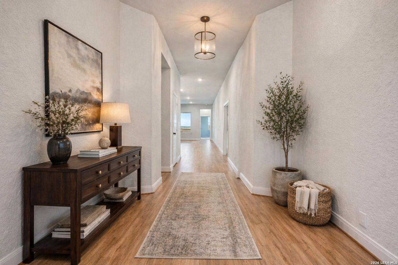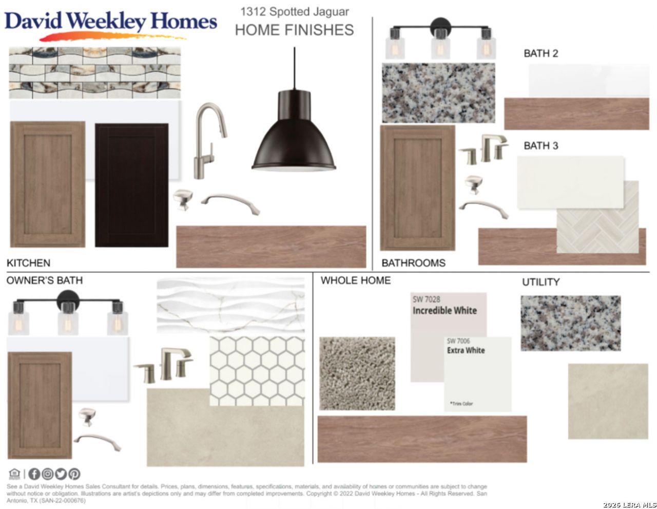 Welcome to 1312 Spotted Jaguar, featuring the Ridgegate floor plan by David Weekley Homes, a beautifully designed single-story home in New Braunfels, TX located in the highly desirable Meyer Ranch master-planned community. This quick move-in home offers exceptional curb appeal with a brick and hardie plank exterior and sits on a prime homesite in one of the most sought-after communities in the Texas Hill Country. Inside, youll find a bright open-concept floor plan connecting the family room, kitchen, and dining area, ideal for both everyday living and entertaining. The home showcases designer-selected finishes, including upgraded cabinetry, ceramic tile flooring, elegant lighting, and stylish tile and hardware throughout. The private Owners Retreat features a spa-like en suite bath, dual vanities, and ample storage, creating a relaxing retreat. A standout feature is the guest suite with its own en suite bath and walk-in shower, providing comfort and privacy for visitors or multi-generational living. An additional secondary bedroom, full bath, and a dedicated home office/study offer flexible living space. A rare 3-car garage offers added storage and functionality-perfect for vehicles, tools, or recreational equipment. Step outside to a covered rear patio, ideal for enjoying peaceful Hill Country evenings. Residents of Meyer Ranch in New Braunfels enjoy resort-style amenities, including a community pool, walking trails, and scenic views, all within Comal ISD and conveniently located near shopping, dining, and outdoor recreation. This new construction home in New Braunfels combines modern design, functional layout, and Hill Country charm, making it a standout opportunity. Schedule your showing today to experience 1312 Spotted Jaguar.