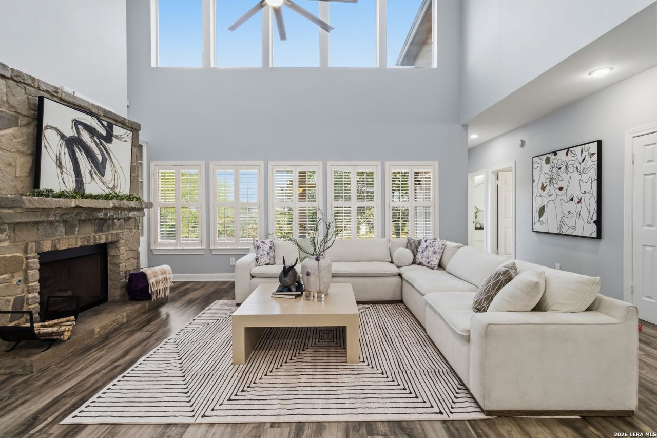 Welcome to this beautifully maintained custom home located in the premier subdivision GREYSTONE COUNTRY STATES, in the Stone Oak area. This home allows living in a guard-gated community with multimillion-dollar homes, and also enjoying walking distance to The Vineyard Shopping Center and easy access to Hwy 1604. This stunning residence offers modern upgrades and thoughtful features that make it truly one of a kind . Step inside to an open floor plan filled with abundant natural light and high ceilings, featuring Master Bedroom and guest bedroom with full remodeled bathroom on the main floor. This home features expansive living spaces, including home office, formal living and dining room for entertaining, and a fireside family room and a breakfast nook for your private enjoy. The oversized kitchen island, ample cabinetry, updated backsplash, built-in KitchenAid microwave and new extractor hood, make the kitchen both stylish and functional. Laundry room conveniently located in this main floor. Enjoy scratch-resistant, waterproof wood-look tile flooring throughout the main level and second floor common areas . Upstairs you will find an spacious game room that could serve as a 5th bedroom, and 2 bedrooms, featuring walking closets and their own private toilet and vanity, sharing remodeled shower area . Unique 200 sq ft bonus room accessed through one of the bedrooms closet, not included in the tax record square footage (SQF)-currently used as a home gym. In-ground pool with brand new high efficiency variable speed pump and extensive driveway with parking area for a 3rd car. Five chandeliers installed on the main floor and updated fans and light fixtures through out the house This home is truly a rare find, offering modern upgrades, comfort, and an unbeatable location all in one, ready to move in. Dont miss out-schedule your private tour today! washer and dryer machines are included.