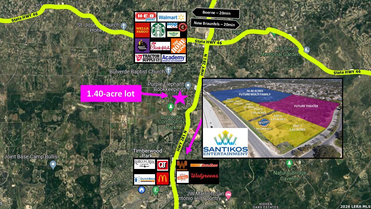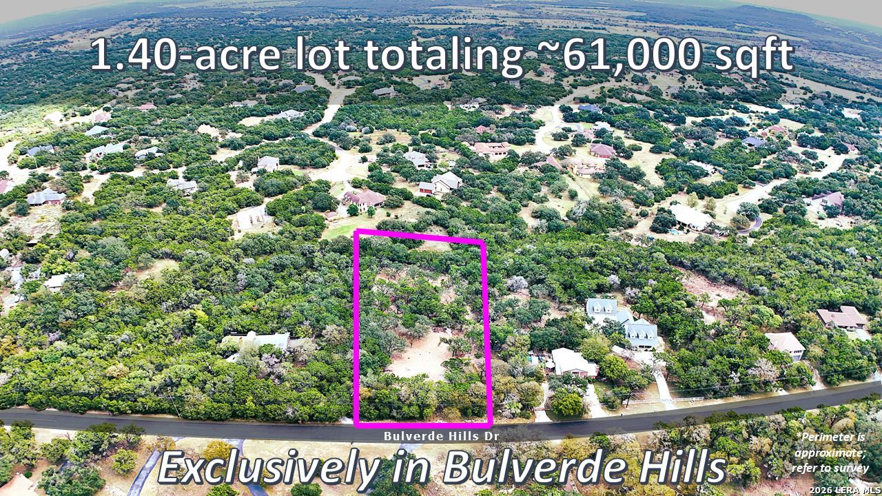 *Priced to sell!* A beautiful 1.40-acre (61,000 sqft) lot at 30806 Bulverde Hills Dr in the desirable Bulverde Hills subdivision ready for your new build or as-is for outdoor enthusiasts. Water and electricity are already available to the property (no water well needed). The lot is cleared in the center, but offers privacy from the road with mature trees, and the potential for a custom home, pool, workshop, and/or outdoor retreat. Foundation quote available upon request for a 3,400-4,800 sqft slab. New survey also included. No mandatory HOA and low Comal County taxes. Conveniently located near HWY 281 N / HWY 46 with easy access to Boerne, New Braunfels, San Antonio, shopping, dining, and Bulverde Community Park. Less than 10 minutes from the future 33-acre Santikos entertainment district. Zoned to highly rated Comal ISD. Experience ideal Hill Country living with space and convenience! Schedule your tour today!