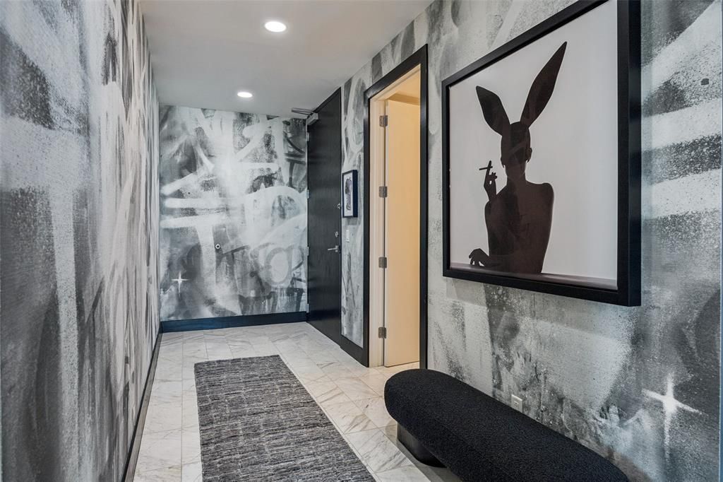 Perched high above the Harwood District, this exceptional Bleu Ciel residence captivates with uninterrupted, floor-to-ceiling views framing the glittering Dallas skyline from every room. The wraparound terrace offers multiple seating areas and a sleek outdoor fireplace, creating a private sanctuary suspended in the sky. Inside, the open-concept living space is wrapped in glass, flooding the home with natural light and showcasing striking modern finishes. The designer kitchen features custom Porcelanosa cabinetry, marble countertops, integrated Miele appliances, and a sculptural island perfect for entertaining against a dramatic skyline backdrop. A dedicated media room adds a luxurious retreat, while the serene primary suite feels like a five-star hotel with its panoramic views, spacious layout, custom California Closet system, and spa-inspired bath. Here, a freestanding soaking tub, oversized marble shower, and illuminated niche detailing create a true wellness experience. Sleek hardwood floors, refined lighting, an effortless flow, and over $100,000 in upgrades elevate the home’s sophistication throughout. Residents of Bleu Ciel enjoy unmatched amenities: two junior Olympic-sized pools with cabanas, a poolside chef’s kitchen, full-service spa, private wine lounge with storage, two boardrooms with advanced AV, a contemporary library lounge, private garages, a state-of-the-art fitness and yoga center, pet park, and 24 hour valet and concierge. Experience the best of sky-rise living—luxury, privacy, and breathtaking views—all in one extraordinary home.
