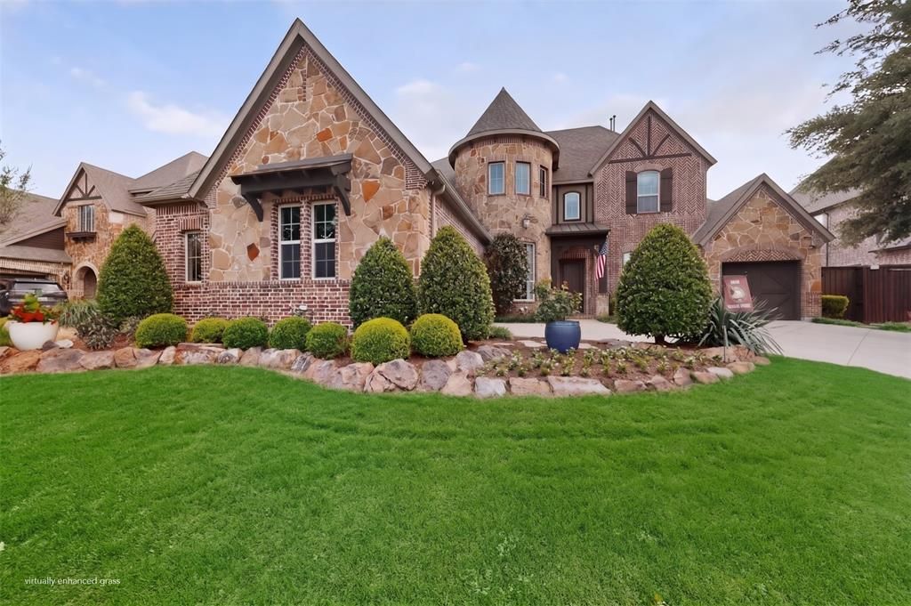 Welcome to Park Place Estates, where luxury meets legacy. This former K. Hovnanian model home is appointed with premium upgrades throughout and just a 5-minute walk from the future Grand Park, a 1,000+ acre destination featuring gardens, ponds, an amphitheater, trails, and community gathering spaces. A soaring staircase sets the tone the moment you walk in, signaling the craftsmanship that defines every corner of this home. Rich hand-scraped hardwood floors sweep across the entire downstairs, anchoring an open-concept layout that flows effortlessly into a sun-drenched living space framed by a wall of windows and a stone gas fireplace. The chef's kitchen is nothing short of showstopping, with a massive island that takes center stage and flanked by professional-grade GE Monogram appliances, double ovens, and a gas cooktop with a built-in griddle. A walk-in pantry and a butler's pantry, complete with a wine fridge, offer extra storage options. The private office is an architectural statement, with double glass doors opening to rounded walls, elegant picture frame molding, and a breathtaking 20-foot ceiling. Retreat to the primary suite, with vaulted ceilings and a serene sitting area. The spa-inspired bath features a soaking tub, oversized shower, dual vanities, and two generous walk-in closets. Upstairs features a game room with rustic beamed ceilings that open to a covered balcony, along with a two-tier media room with a wet bar and refrigerator for movie nights and game days. Outside, mature trees shade a backyard made for outdoor living, with a covered patio featuring a gas fireplace and a built-in grill with granite countertops that create an inviting outdoor entertaining space. Garage space this generous is a rare find, with a dedicated single-car garage plus an oversized two-car garage with plenty of room remaining for a golf cart, ATV, or motorcycles. All of this is in the highly acclaimed Frisco ISD, just minutes from Toyota Stadium, The Star, and PGA Frisco.