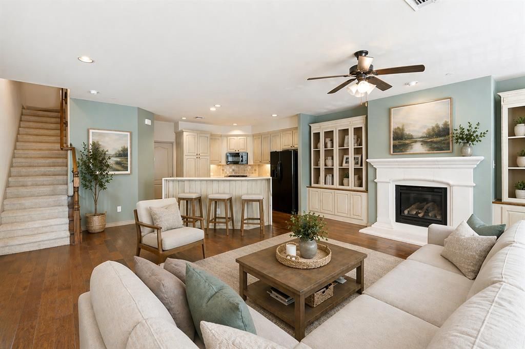 This stunning end-unit townhome backs to a peaceful greenbelt and is just a short walk to the amenity center, pool, and serene park—perfect for enjoying the outdoors without the upkeep. The open and spacious living area is ideal for everything from cozy nights in to hosting friends, flowing effortlessly into a stylish kitchen with bar seating, a gas cooktop, beautiful cabinetry, and updated quartzite countertops with a waterfall edge, plus a Kohler sink and faucet. The main living space features a statement cast-stone fireplace with custom built-in bookshelves, adding both warmth and regal style. The primary suite is filled with natural light and feels like a true retreat, complete with a spa-inspired bathroom offering a soaking tub, walk-in shower, dual sinks, and an impressive walk-in closet. Two additional bedrooms on the second level provide comfortable, private space for guests or a home office. The third-floor fourth bedroom is incredibly versatile—perfect for a media room, game room, or private guest suite—and opens to a huge balcony along with an oversized storage area. An indoor storage room leads to the utility area for the AC units. You’ll also love the oversized two-car garage conveniently located off the kitchen, making grocery runs a breeze. Recent updates include a roof replaced in 2017, new outdoor HVAC units in 2024, and furnaces updated in 2022 and 2023. Enjoy low-maintenance living with HOA-maintained exterior and front yard, plus resort-style amenities like a clubhouse, fitness center, pool, walking trails, and card room. Ideally located near Prestonwood Christian Academy, Willow Bend Mall, and Prestonwood Country Club, this home offers easy access to top shopping, dining, and entertainment. New carpet is on order, with the buyer able to select the color of their choice.