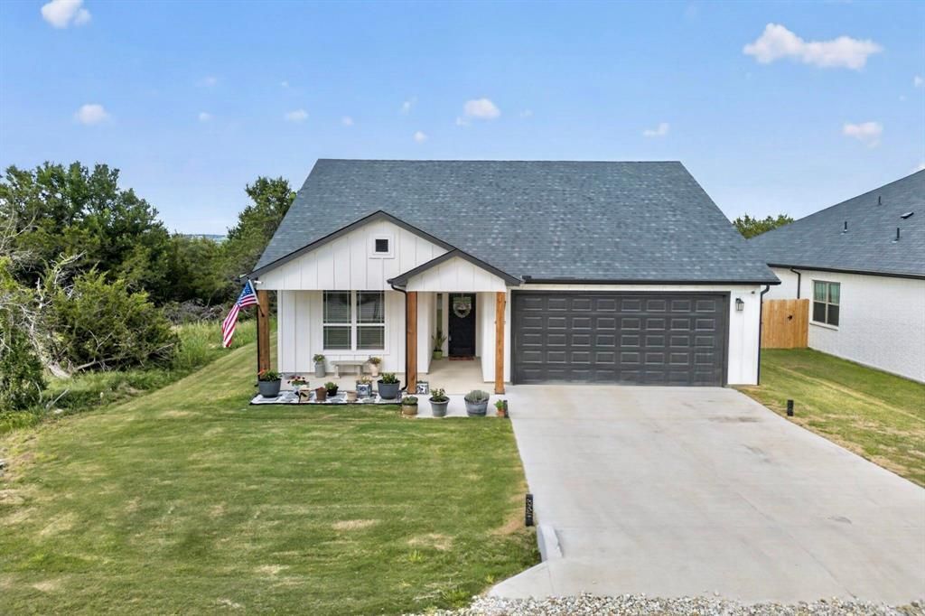 Modern farmhouse with a great layout & scenic lake views sitting on over a quarter of an acre! Located in a gated community nestled along Lake Granbury, residents of Canyon Creek enjoy a LOW HOA with access to multiple pools, tennis + basketball courts, a playground & private boat launch. Built in 2024, this like-new home is packed with perks. Step off the sizable covered front porch into an open floor plan filled with natural light pouring in from oversized windows throughout. Kitchen is complete with quartz counters (sturdy yet sleek), a large island, SS appliances & tons of cabinet storage. Full laundry room conveniently located right off the kitchen. Split bedroom layout makes for a highly private primary suite, featuring vaulted ceilings & a gorgeous ensuite with dual sinks, a Hollywood tub, glass shower & massive walk-in closet. Outside, an expansive backyard boasts beautiful views of the lake & great space for entertaining or relaxing! The sellers have further enhanced this outdoor setup by extending the back patio & fully enclosing the backyard with wrought iron fencing. PLUS, this home offers an oversized 2-car garage, perfect for larger vehicles & added storage space. Situated along a quiet cul-de-sac, minutes from tons of outdoor activities including easy access to Harbor Lakes Golf Club, local fishing spots, neighborhood sport courts, boat slips & more. Come see everything lakeside living has to offer!