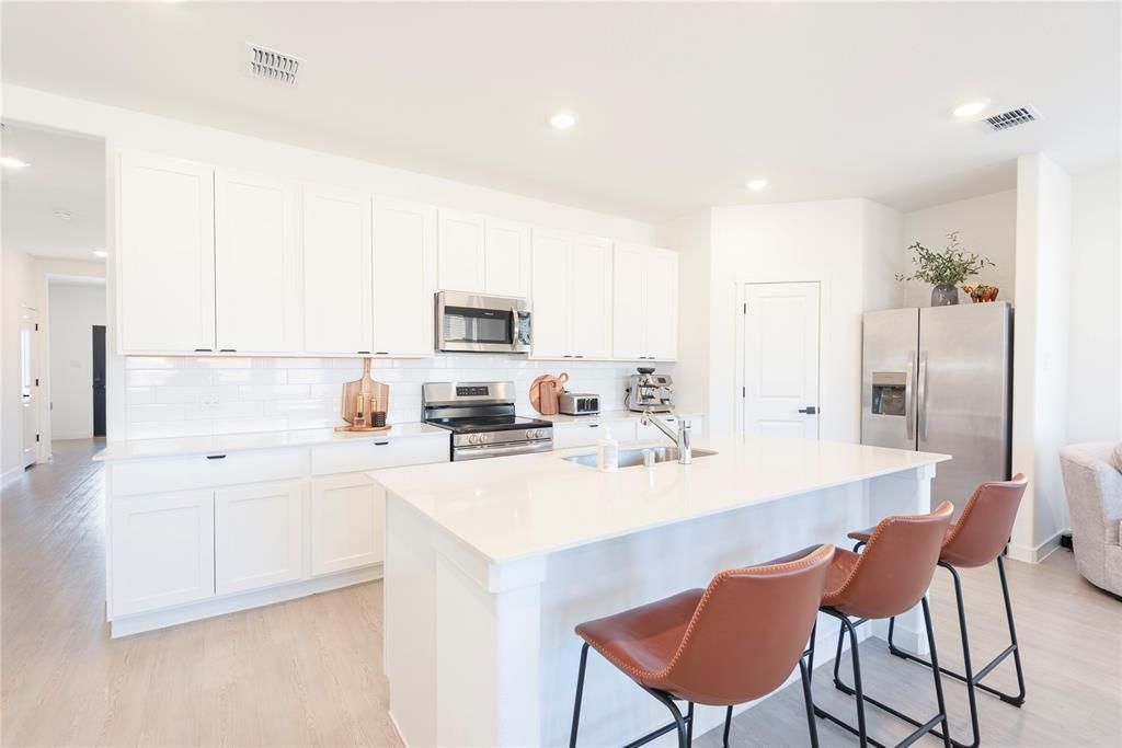 Barely lived in and move-in ready, this pre-owned Lennar Hendrix floorplan is located in the highly sought-after Bridgewater community in Princeton. The single-level layout offers a modern, low-maintenance design with an open-concept living, dining, and kitchen area that flows seamlessly to an inviting covered patio, perfect for everyday living or entertaining.Three well-appointed secondary bedrooms are thoughtfully positioned off the foyer, while a versatile flex space near the main living area is ideal for a home office, studio, or additional lounge. The private owner’s suite is tucked away at the back of the home, offering a peaceful retreat with a spacious en-suite bath and walk-in closet.Residents of Bridgewater enjoy resort-style amenities, including a community pool, parks, walking trails, playgrounds, and green spaces, all within a master-planned neighborhood conveniently located near US-380, shopping, dining, and highly rated schools.