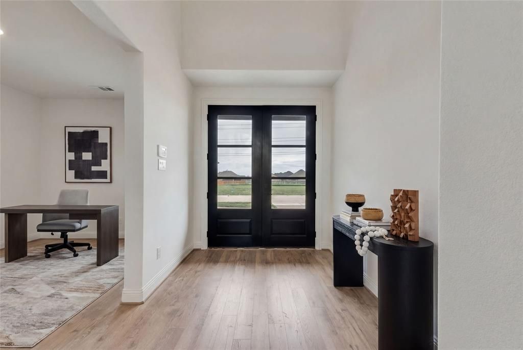 Welcome to this stunning new construction East-facing home that blends modern luxury with thoughtful design in a highly sought-after location. Situated in exceptional Mansfield ISD, all schools are just a short walk or bike ride away. Ideally located between Dallas & Fort Worth, you'll enjoy easy access to shopping, restaurants, and entertainment. This Energy Star Certified home features impressive curb appeal with double front doors and extensive hardwood flooring. Inside, you'll find five spacious bedrooms, a private home office or den, with a downstairs guest suite—perfect for multigenerational living. The open-concept design centers around a groin vaulted family room with a sleek linear fireplace and floor-to-ceiling stonework, flowing seamlessly to a large covered patio with a gas line for BBQ. A full oak staircase with modern wrought iron spindles, eight-foot interior doors, and rocker light switches add to the home’s refined style. The chef’s kitchen boasts Shaker-style cabinetry, Omegastone countertops, a five-burner gas cooktop with commercial-grade vent hood, stainless steel appliances, a built-in trash drawer, and an enlarged island. Downstairs also includes a media room, while upstairs offers a game room and a flexible bonus space or children's retreat. The elegant primary suite features a freestanding tub, dual Marlana vanities with framed mirrors, rectangle sinks and a glass-enclosed tiled shower. With R-38 insulation and a radiant barrier for energy efficiency, this move-in-ready home offers comfort, style, and convenience in a top-tier school district.